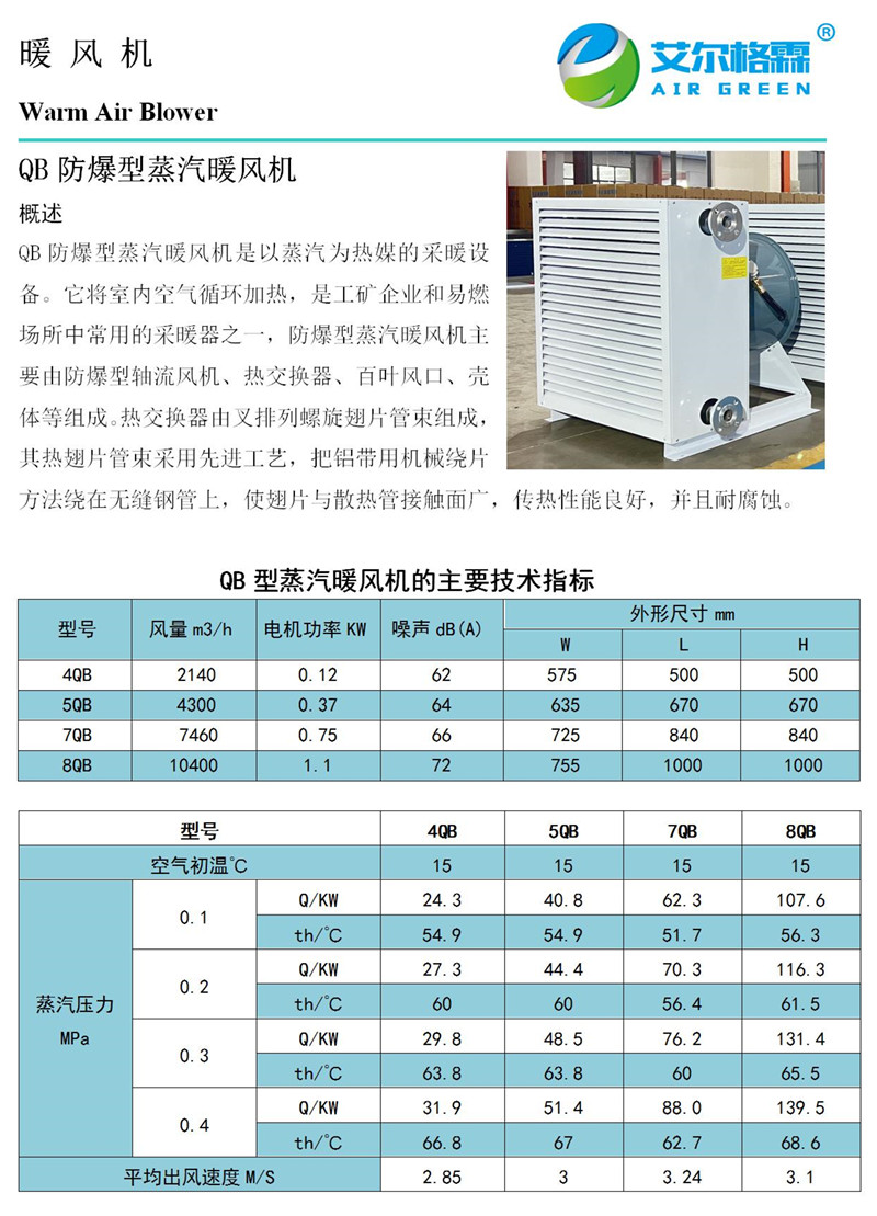 Q-B防爆型蒸汽暖風(fēng)機(jī)是在普通型蒸汽暖風(fēng)機(jī)基礎(chǔ)上的延伸產(chǎn)品。采用BT35-11防爆型軸流風(fēng)機(jī),適合煤礦、化工等特殊行業(yè)。